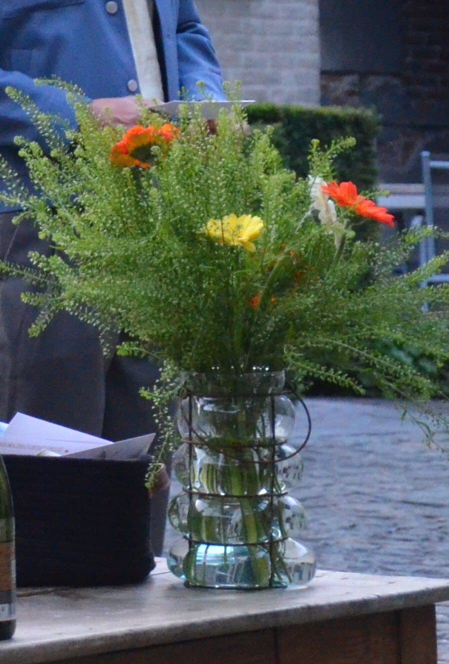 - Materiaal: transparante vaas van glas, omringd door een decoratief metalen frame